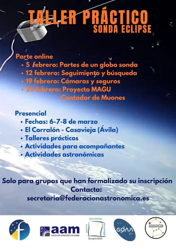 La formación se estructura en una primera fase online, que arranca en febrero, en la que se están abordando los aspectos fundamentales del proyecto. A lo largo de varias sesiones se tratarán las partes que componen un globo sonda, los sistemas de seguimiento y recuperación, el uso de cámaras, los seguros necesarios y proyectos científicos concretos asociados al eclipse, como el Proyecto MAGU, centrado en la detección de muones.